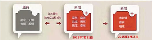 今年1月15日,经江苏省十二届人大常委会第20次会议审议通过,连云港、淮安、宿迁三个地级市获得“地方立法权”。至此,江苏13个设区市先后获得立法权。