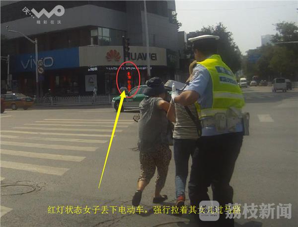 女子根本不听民警劝说,直接丢下电动自行车,拉着孩子就往马路对面冲,因为此时仍是红灯,交警赶紧上前将这名中年妇女拽了回来。