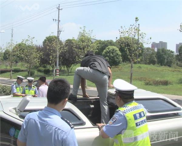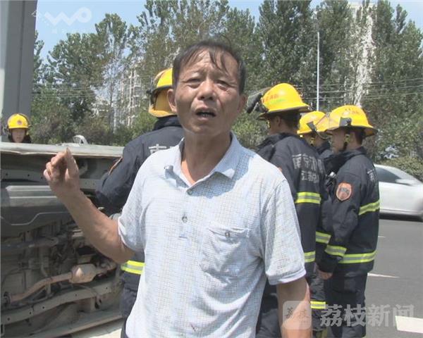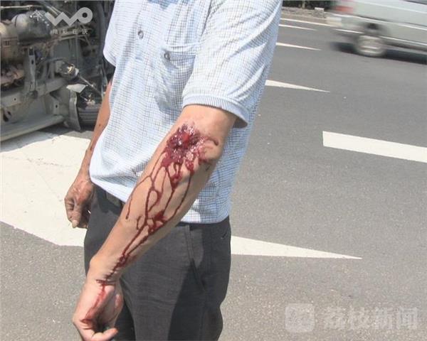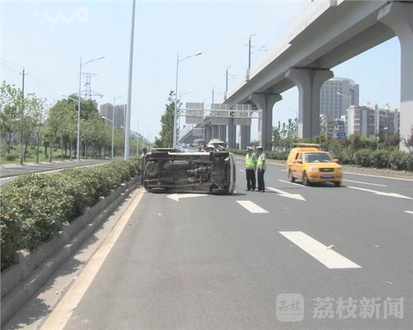 在江北大道现场看到,一辆南京拍照的面包车侧翻在马路中间,司机张某左侧手臂受伤流血,车上三人刚爬出车外。