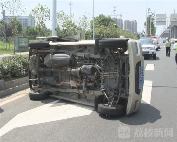 今天(8月15日)中午11:30左右,南京江北大道葛塘段,一辆小型面包车侧翻在快速车道中间,车上两人轻伤。