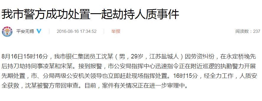 据@平安无锡 通报,8月16日15时16分,无锡市银仁集团员工沈某(男,29岁,江苏盐城人)因劳资纠纷,在永定桥堍先后持刀劫持同事凌某和宋某。接到报警,市公安局指挥中心迅速指令正在附近巡逻的执勤警力开展先期处置,市、分局两级公安机关领导也立即赶赴现场指挥处置。16时15分,经全力工作,人质安全获救,沈某被警方带回审查。目前,案件有关情况正在进一步审理中。