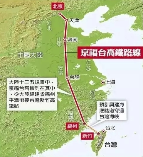 合肥到台北的直线距离约873公里,如果按照现在的高铁时速,不到四小时就能到达台北了!