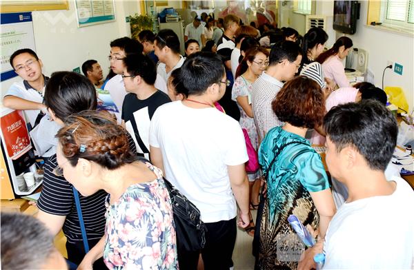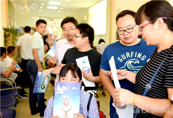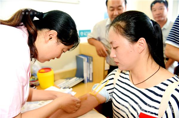 2016年8月19日上午,仪征市万年路上的爱心献血屋里,市中心血站的医务人员正在为献血的100多名真州镇党员干部检验抽血。