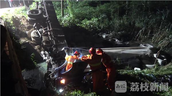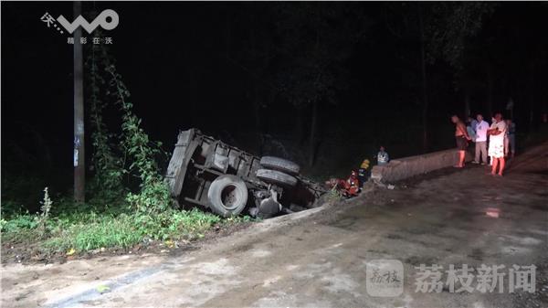 昨天(8月20日)凌晨1点多钟,徐州市铜山区何桥镇境内,一辆满载水泥的大货车侧翻在水沟中,驾驶员被困。接到报警后,矿山路消防中队立即赶赴现场救援。