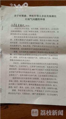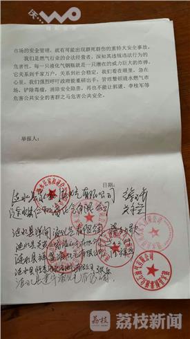 在涟水县住建局举报的时候,记者还看到了一份实名举报信,该举报信由涟水县7家正规的液化气充装站联名举报,举报给涟水县住建局的吴局长。