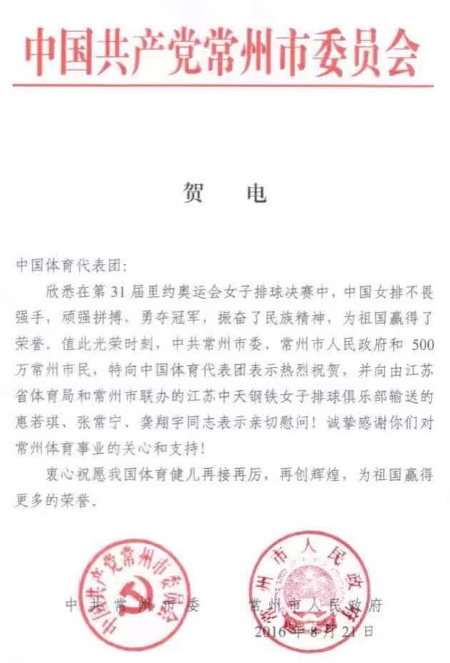 今年2月,惠若琪、张常宁、龚翔宇所在的江苏中天钢铁女排队在常州获得2015-2016赛季全国女排联赛年度亚军,这也是江苏女排队16年来首获全国亚军。2014年3月,中天钢铁集团正式入主江苏女排,成立江苏中天钢铁女子排球俱乐部有限公司,成为国内第三支女子排球俱乐部、常州首支职业体育俱乐部。上赛季,常州赛区承担了联赛的15场比赛,赛事场地在武进体育馆。
