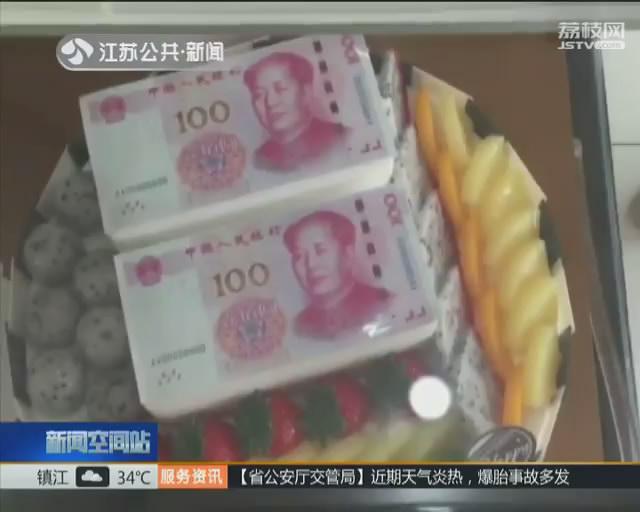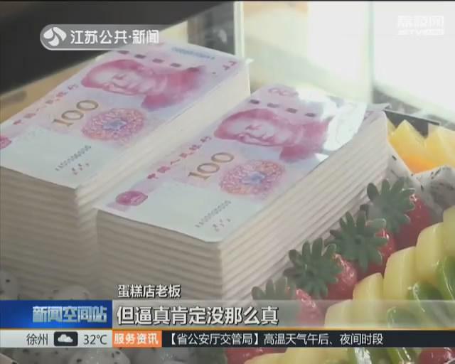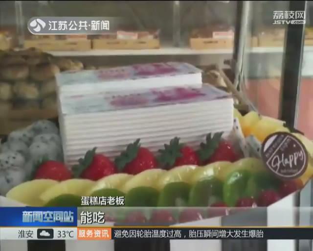 在苏州的一家蛋糕店,两名顾客正被一款“人民币”造型的蛋糕所吸引。眼前这款蛋糕,配有火龙果、草莓等颜色各异的水果,不过,最吸引眼球的,还是中间两大摞造型逼真的百元人民币。记者注意到,蛋糕最表层的两张人民币图案,并不是手工绘制,跟新版真钞几乎一摸一样。蛋糕店老板说,这种人民币图案是用糖纸做的,也是可以吃的。