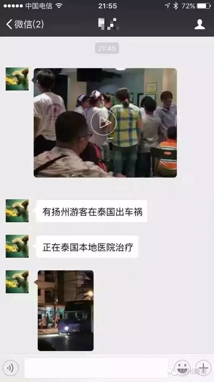 昨晚9点多,扬城微信朋友圈内爆料,有扬州游客在泰国发生车祸,目前正在泰国当地的医院进行治疗。