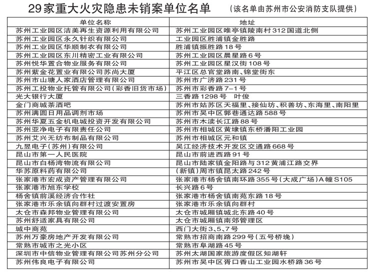 昨天(8月22日)下午,苏州市公安消防支队通过商报对外公布一批重大火灾隐患未销案单位。此次检查,重点对重大火灾隐患未销案单位的名称、地址、责任人进行集中曝光,以进一步推动重大火灾隐患的有效整改。
