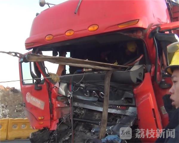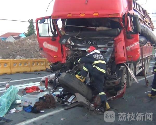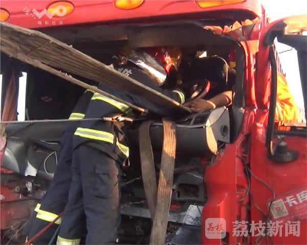 8月24日清晨5点左右,新237省道扬州市宝应县氾水段,发生一起两车追尾事故,后车司机受伤被困车内,亟待救援。当地交警、消防、120急救等部门接警赶到,将司机救出,不幸的是,司机因伤势过重身亡。事故路段,一辆装载布料和纺织设备的红色大货车面目全非,右前轮脱落,杂物散落一地,驾驶室凹陷进去,司机被困狭小空间。救援人员在方向盘杆上绑好钢丝绳,往外牵引,尝试拉开空间。交警设置警戒,禁止车辆通行。