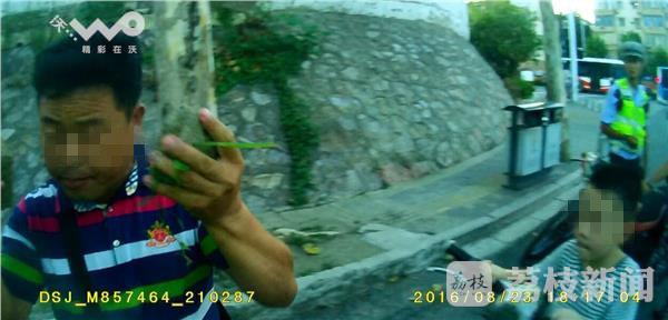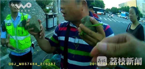 民警表示电动自行车只能带一名12岁以下未成年人,而男子驾驶电动车明显违规带人了,要处以20元罚款。男子表示第一次希望民警能够通融一下不要罚款,交警表示依法要处以20元罚款。男子情绪突然激动,说要死给交警看,到路边捡起来两块砖头,做出要砸自己的举动,后被交警夺下。争执几分钟后,民警最后还是对他处以20元罚款后放行。