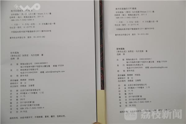 盗版书与正版书之间的差异已十分微小,但仔细观察还是能发现不同之处。这也是出版社鉴定真伪的手段之一。左边盗版书“百年孤独”字体比右侧正版,要细。