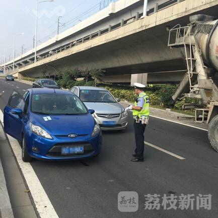 近日,南京交警十大队辖区江北大道快速路晓山路匝道口,一蓝一银两小车发生碰擦,一个车头一个车身擦掉些油漆,蓝车车主认为自己正常行驶完全没有责任,因有急事在身不与银车计较,可第一次遇到碰擦事故的银车车主满脸大写加粗的懵啊。