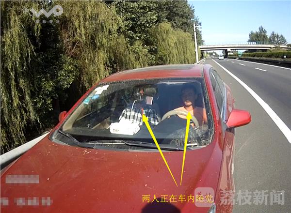 8月30日下午3点多,徐州交警高速四大队民警在巡逻至淮徐高速176公里处时,发现一辆红色轿车违停在高速公路应急车道,车后未放置任何警示标志。民警下车查看后,发现两名男子正躺在车内睡觉。