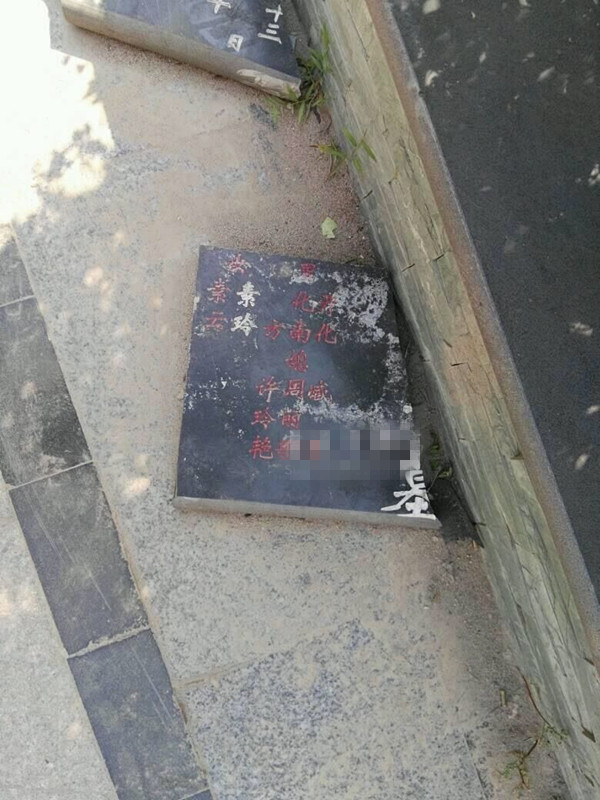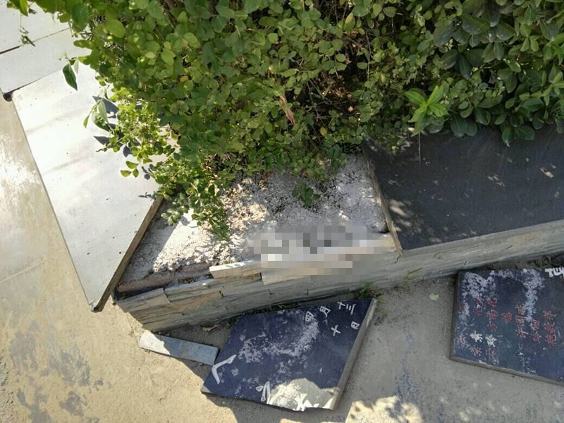 " 现在水泥上还有字呢。" 附近一位超市老板为了证实此事的真实性,特地带记者到事发地点查看。如他所言,这处花坛上的大理石虽然已经被拆走,但从已经凝固的水泥上,仍旧可以看到 "XXX 之墓 " 这几个字的印记。