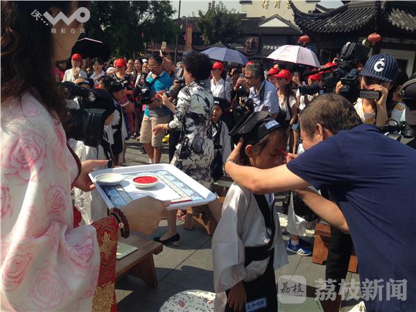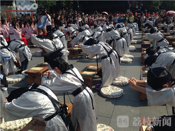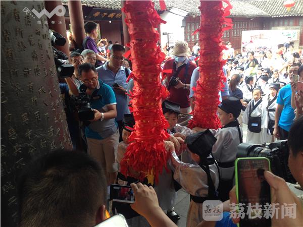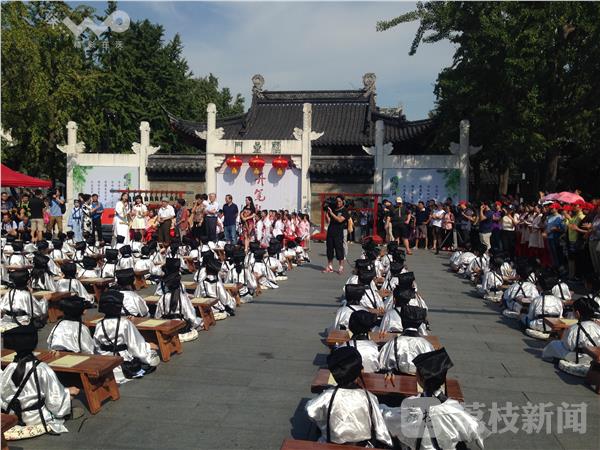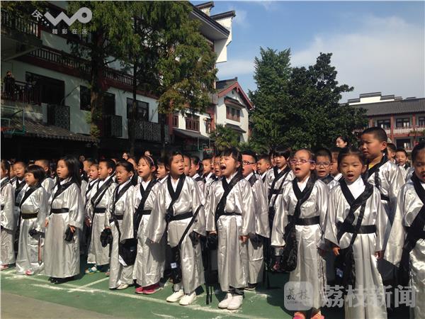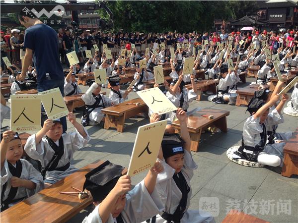 “古乐声声,欢乐阵阵。击缶而歌,文化传承……”今天上午,南京夫子庙小学2016届一年级新生“开笔礼”仪式在夫子庙广场举行。仪式在国乐团演奏的《礼.记大学》中拉开了帷幕。