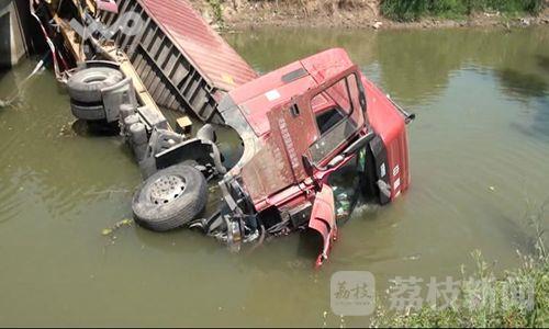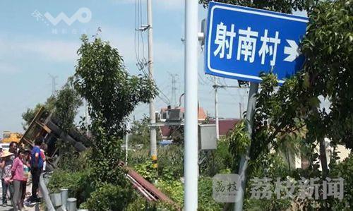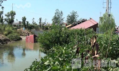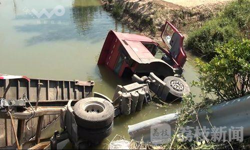 荔枝新闻记者赶到现场时,还有不少附近的村民在围观,一辆集装箱货车头朝南侧翻在由南向北车道右侧的河里,半个驾驶室被闷在水里,左侧的驾驶室车门开着,雨刮器还在不停地刮动,车厢的后半截翘在那里,路边的隔离护栏被撞坏折断,一双棕色皮鞋抛在路边,路面上有长长的黑色车轮刹痕。但是在现场没有发现三轮车的踪影,听围观的村民讲,三轮车压在货车驾驶室下面的水里,所以看不到车子。随后通过肇事货车驾驶员了解到,当时他是由北向南行驶的,在通过该路口时,一辆不知道是电瓶车还是摩托车的车辆要横穿马路,他本能的反应就开始朝左侧猛打方向进行避让,在车子避让到由南向北的车道里时,三轮车正好也行驶到这里,结果就与三轮车发生了碰撞。