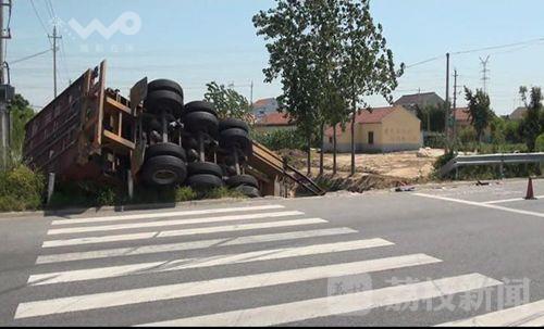 8月31日上午9点钟左右,在国道228线射阳县海通镇射南村境内的一处无灯控十字路口,一辆由北向南行驶的大货车在避让右侧路口一辆准备横穿马路的摩托车时,朝左侧猛打方向,结果与左侧车道内一辆由南向北行驶的三轮车发生碰撞,在巨大的惯性作用下,大货车推着三轮车冲到路边的河中,事故导致三轮车驾驶员当场死亡,两车损毁严重。