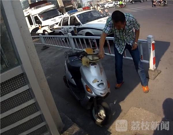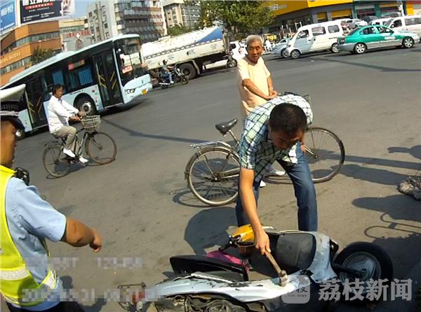 随后男子又跑到路边店铺找来一把铁锤,抡起铁锤对车辆就是一顿猛砸。转眼间这辆摩托车已是千疮百孔,被敲落的碎片散落了一地,引起许多路人的围观。