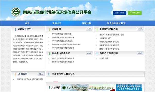 登陆“南京重点排污单位信息公开平台”官网“http://222.190.111.117:8008/NJ/Index.aspx”,可见醒目位置设有四个版块,分别为“政策法规”、“重点排污单位列表”、“重点排污单位名录”和“自愿公开单位列表”,其中“自愿公开单位列表”暂无数据显示,整体设计简洁明了,重点突出。记者点进“重点排污单位列表”,发现目前共登记了350家排污单位,点击“查看”则能看到该企业联系方式、废气废水排放情况等信息。