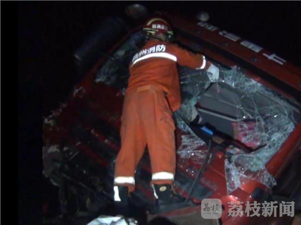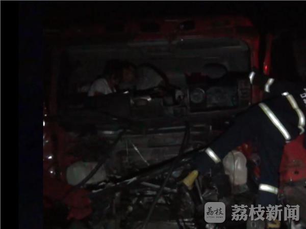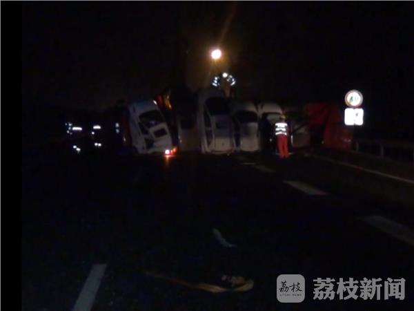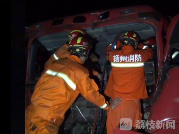 9月2日凌晨2点30分左右,京沪高速公路扬州市 宝应出口附近,发生一起三车连环追尾事故,最前方轿运车被撞后,拖载的电动汽车掉下来,两货车内共四人被困,情况紧急。当地交警、消防、120急救等部门接警,迅速赶赴现场救援。