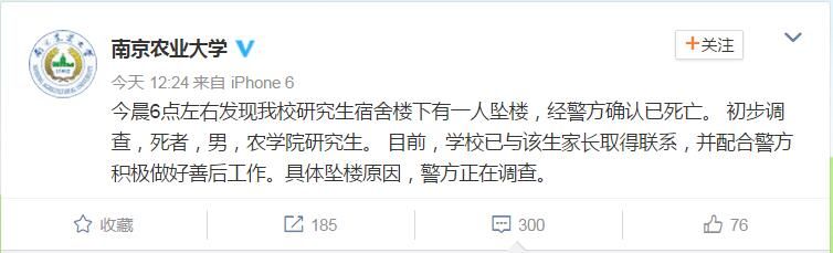 据南京农业大学官方微博消息,今晨(9月3日)6点左右,发现我校研究生宿舍楼下有一人坠楼,经警方确认已死亡。初步调查,死者,男,农学院研究生。目前,学校已与该生家长取得联系,并配合警方积极做好善后工作。具体坠楼原因,警方正在调查。