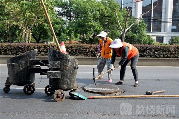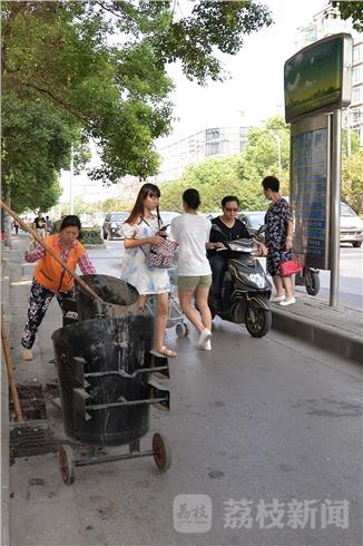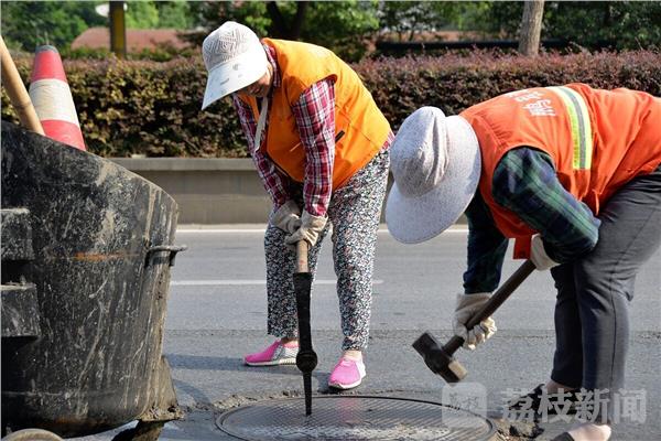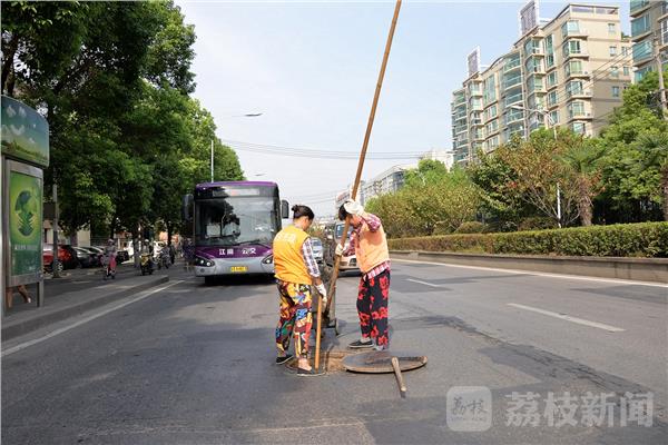 9月5日上午,荔枝新闻网友路过秦淮区光华路天堂村公交站台时见,有10名清淤女工正奋力打开马路下水道井盖,打开后,清淤女工用长柄勺从下水道内挖淤泥。