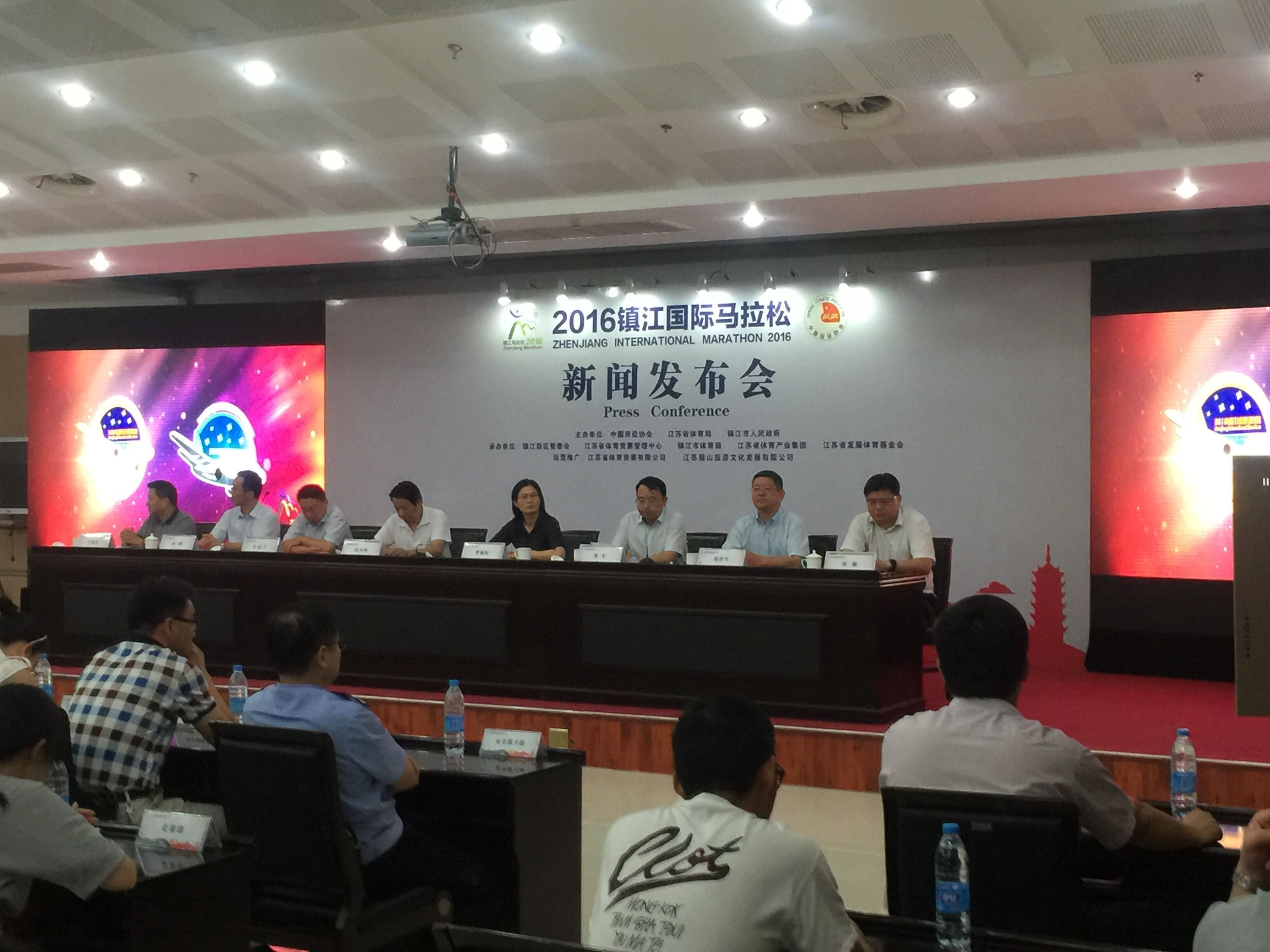 2016年9月5日下午3点,2016镇江国际马拉松新闻发布会在江苏省体育局隆重举行。江苏省体育局副局长颜争鸣、镇江市人民政府副市长曹丽虹、江苏省体育竞赛管理中心书记朱晓军、镇江市人民政府副秘书长张军、镇江市体育局副局长承纲、镇江新区党工委副书记刘祥生、江苏省体育产业集团副总经理王先正和各有关部门领导出席了新闻发布会,会议由镇江市政府副秘书长张军主持。
