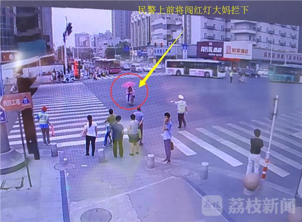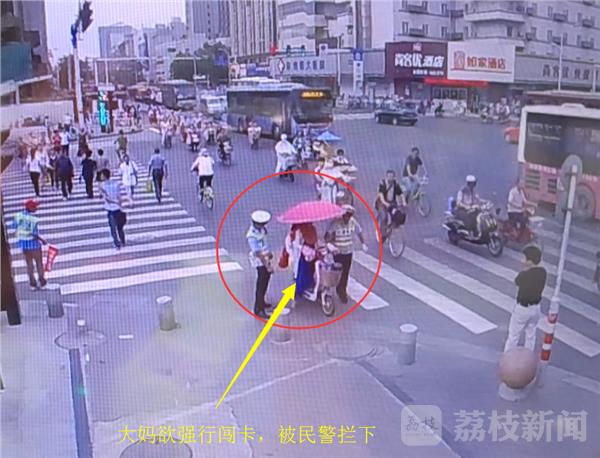 当天中午,在徐州市复兴路与淮海路交叉口东西方向的信号灯显示红灯,这时,一名女子载着另一名女子骑电动车完全不顾红灯的存在,径直闯过来。看到这个情况,执勤协警发现后立即将其拦下,面对协警的拦截,两女子没有理会,硬要冲卡过去。