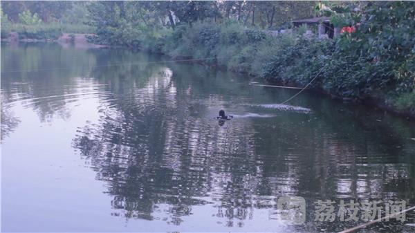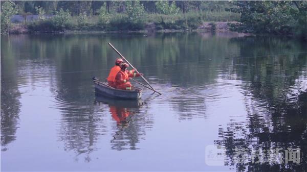 记者到达现场时,消防员正在利用池塘内的小船拿着钩子前往溺水者遇难的地方进行打捞。不远处消防潜水员正在进行潜水打捞。