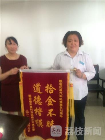 9月9日上午,家住南通如皋市搬经镇朱夏村的杨女士带着一面“拾金不昧 道德楷模”的锦旗来到如皋客运站,向拾金不昧的售票员刘丽华表示感谢。