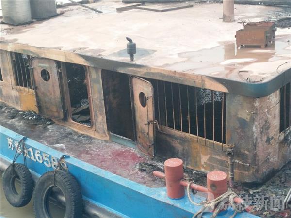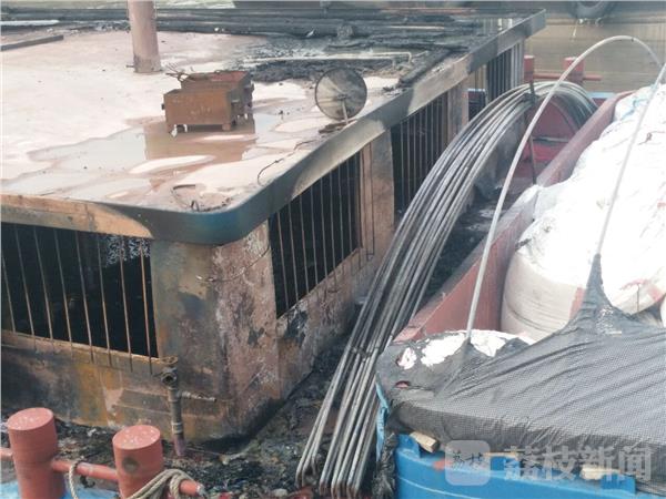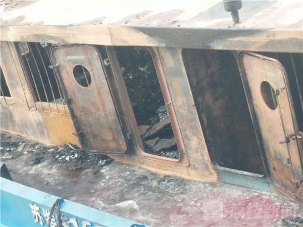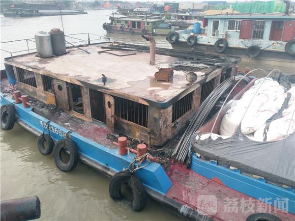 荔枝新闻通讯员在现场看到,一名船员被烧伤已送往医院,船尾船舱已经烧成废铁,所幸船中货物没有燃烧,据了解,货船为苏淮货16588,货物是1400吨的石粉前往苏南,目前怀疑线路老化引起火灾,具体原因还在调查中。