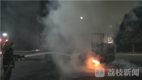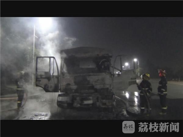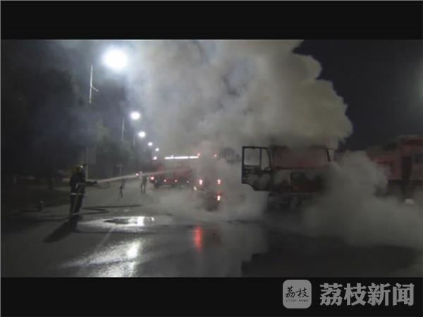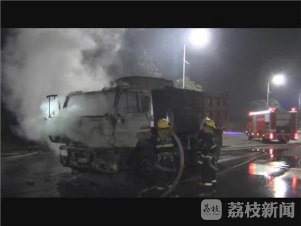 昨天晚上10点多,在南京江宁区将军大道和吴歌路路口,一辆行驶中的渣土车突发自燃,虽经消防全力扑救,车子还是被烧得完全报废。
