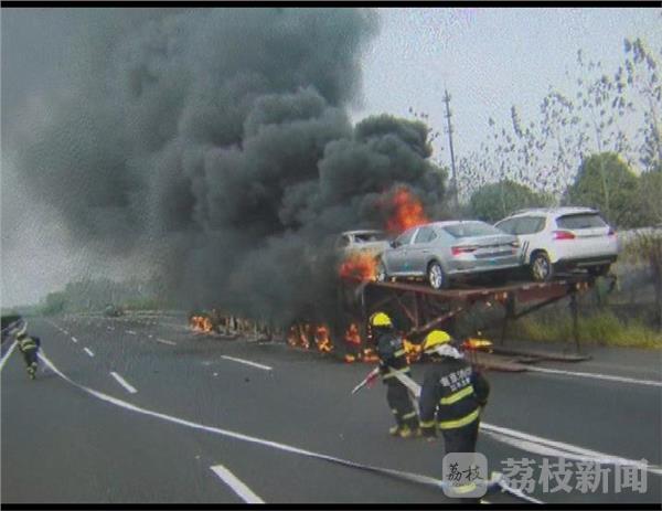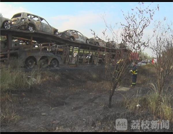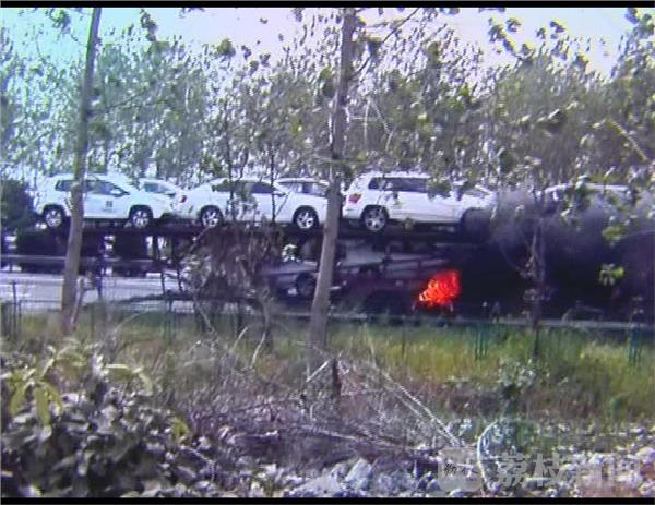 9月11日下午3点,一辆从仪征开往连云港方向装载21辆新轿车的大货车行驶到宁连高速公路南京六合竹镇段时,大货车后轮胎冒烟后燃起大火,消防官兵赶到时,半小时将大火扑灭,可是,大货车上面的21辆新出厂的轿车几乎全部被烧成废铁。
