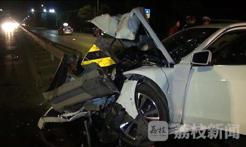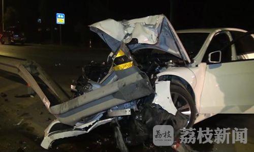 记者赶到现场时,白色奔驰轿车上受伤的三名驾乘人员已被120救护车接送到医院抢救,事故处理民警正在对现场进行勘查,一辆白色的奔驰轿车头朝东停在由北向南的快车道上,车头部分已经面目全非,还死死的与路中央的钢质隔离护栏咬在一起,引擎盖隆起变形,前挡风玻璃呈网格状破碎,驾驶室内两只安全气囊全部打开,副驾驶座椅靠背前倾,座位上血迹斑斑,车子右后尾灯损坏,保险杠断裂。一辆吉普车头朝南停在路边上,前保险杠左侧有明显的碰刮痕迹,几米长的钢质隔离护栏因受到巨大的撞击而弯曲。吉普车驾驶员告诉记者,他是跟在白色奔驰轿车后面正常行驶的,不知道什么原因,轿车就突然撞上了护栏,巨大的惯性作用是车子旋转了九十度,他在避让不及的情况下,与轿车的车尾部发生轻微碰刮,轿车上一共有三名驾乘人员,全部受伤。