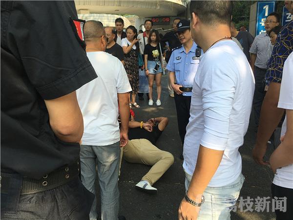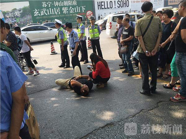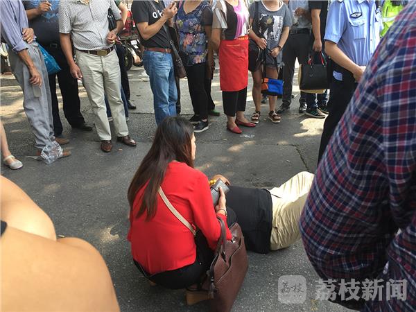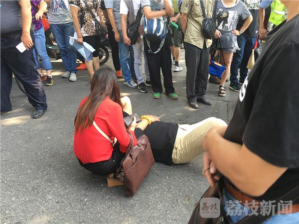 上午9时许,荔枝新闻网友骑车由东向西经过广州路江苏省人民医院停车场大门口时,看到停车场大门口围着一大群人,从人群缝隙中看到,有一位穿黑色上衣的年青壮汉躺在地,手捂眼睛,鼻孔淌血,痛苦不堪。男子的旁边还蹲着一位穿红色上衣的年青女子,据说是他的妻子。