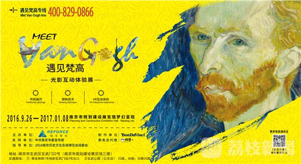 《遇见梵高》光影互动体验展位于美丽的玄武湖畔,南京市规划建设展览馆三楼,展览面积约1600㎡,展览时间为2016年9月26日至2017年1月8日。此展区别于传统的静态展览模式,改变了固有的观展体验,运用了高科技互动体验的现代感映技术,通过激光数码高清投影与环绕音响的完美组合,将梵高的传统画作在大型电子显示屏和巨幅投影机上展现出来。1000多副画作在40多面投影布上轮番变换,多角度大画幅、移步异景地展现画作,为参观者提供全新五感享受,不仅有光与影强烈对比所带来的视觉冲击,还使观众有种身临其境,被名画包围的感觉。