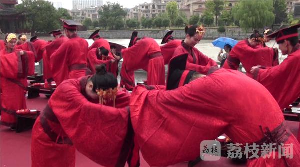 20对新人现场身着交领、胡袖、带有长长拖尾的绚丽汉服,以行汉代七礼成亲,取汉民族举案齐眉、相敬如宾、白头偕老的婚姻内涵,淮安自古有在运河用船接亲的风俗,上午9点,在瑟瑟冷风中新郎们坐着龙船满面幸福地接新娘上岸,当婚礼正式开始。但见20对新人身着汉服,依据汉代人结婚的婚礼习俗,依次进行了沃盥礼、同牢礼、合卺礼、行解缨配绶礼、执手礼、三拜礼等古代婚礼礼仪。市民一边观赏,一边学习古礼,像“同牢合卺礼”,就是一对新人跪于垫上,同吃一块肉,同饮一杯酒,以示婚后共同生活。