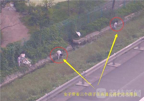 监控上显示,一名30岁左右的女子穿着拖鞋拿着网兜在高速下面的排水沟来回穿梭,旁边一名十来岁的小男孩弓着腰站在水沟内摸鱼,在不远处的沟边还站着两名女孩。女子忙着捕鱼,根本没有去留意孩子的安全,尽管水沟不深,如果小孩不小心掉到沟内未及时处置的话很可能造成严重后果,如果小孩调皮跑上高速公路的话很可能引发事故。
