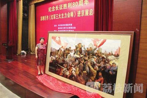 荔枝新闻记者今天(9月20日)从苏州市文广新局获悉,由16位绣娘历时56000个工时,用近两百组色系、近千余种颜色丝线,绣成长281厘米宽145厘米的苏绣作品《红军三大主力会师》,即将在北京展出。