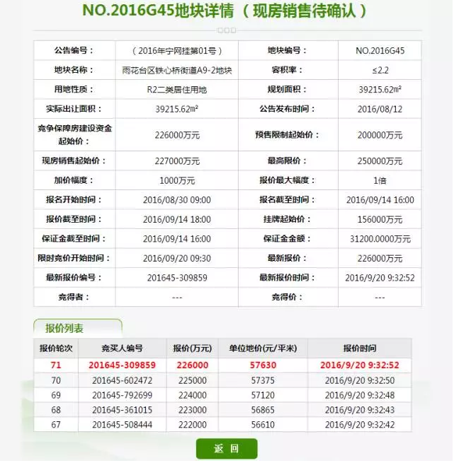 G46地块,第94轮报价250000万元,已达到最高限价,现房销售待摇号确认阶段!