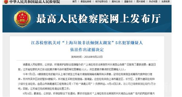 荔枝新闻记者今天(9月22日)获悉,由最高人民检察院、公安部、环境保护部联合挂牌督办的“上海垃圾非法倾倒苏州太湖西山岛案”日前有了最新进展。截至日前,江苏省检察机关已依法批捕涉嫌污染环境罪犯罪嫌疑人3人,决定逮捕涉嫌渎职犯罪嫌疑人2人。