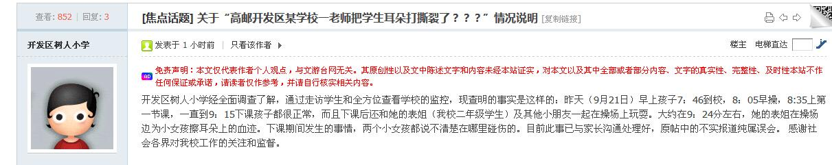 女生耳朵被老师打裂,网帖是否属实?现代快报记者9月23日上午与高邮市教育局取得联系,该局办公室、法制科、监察室相关人士均表示不了解相关情况。此后,高邮市经济开发区在网上对此事进行了回应,称“原帖中的不实报道纯属误会”。