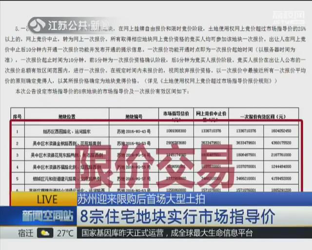 苏州昨天迎来限购后市区的首场大型土拍。在为期两天的土拍中,苏州共推出27宗地块,其中8宗地块设定了市场指导价。昨天土拍的地块有3宗限价,并全部转为网上一次报价,但溢价率仍然偏高。