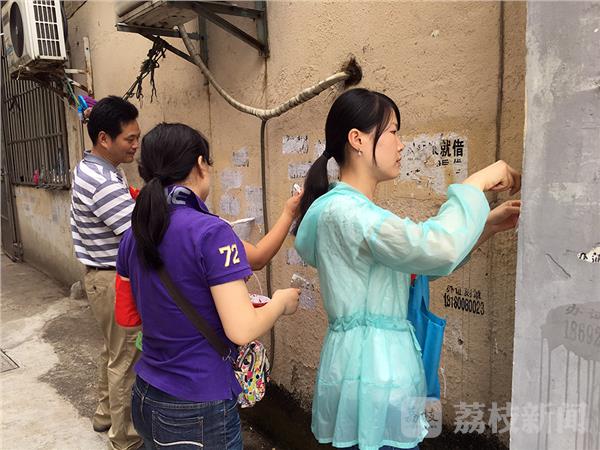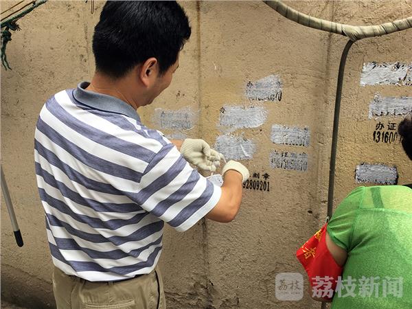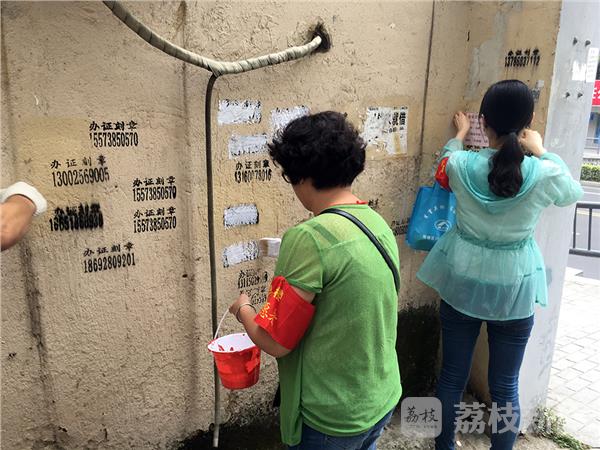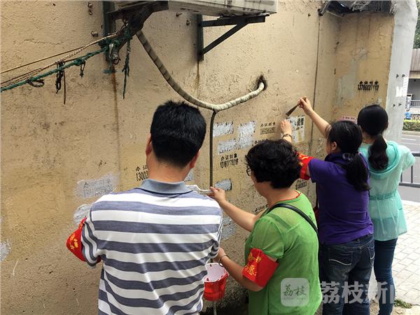 国庆临近,南京全城开始布置鲜花和大扫除,2016年9月25日下午,在南京上海路,一群穿戴红色袖章的环卫志愿者,利用周末休息时间,纷纷走上街头,清除社区楼道、围墙、电线杆上的黑色垃圾广告。
