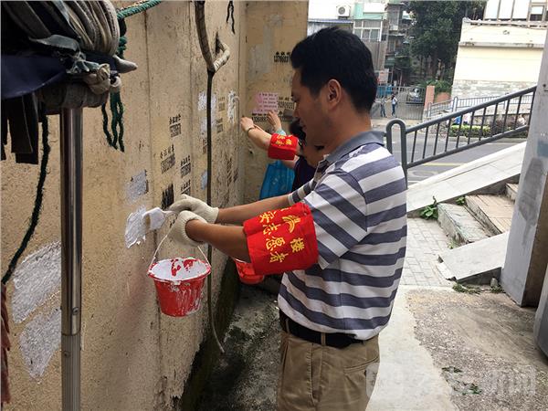 这群来自社区的志愿者有男有女,有年青人也有老年人,他们利用休息天,一手提着油漆桶,一手拿毛刷子,一次又次地刷去印在小区楼道上的“办证刻章、打孔、疏通” 等“牛皮癣”,受到市民们的称赞。