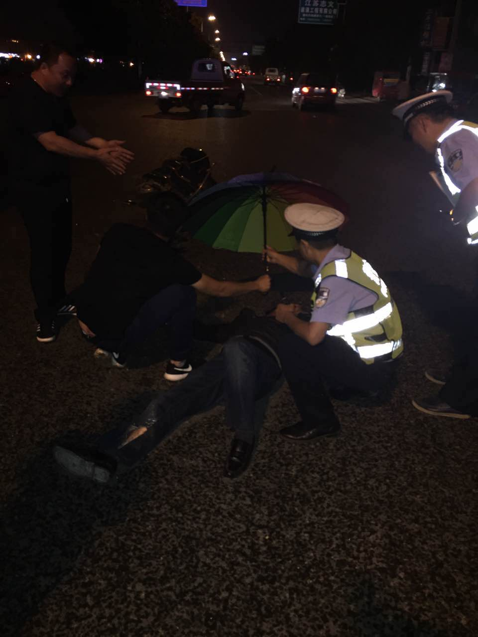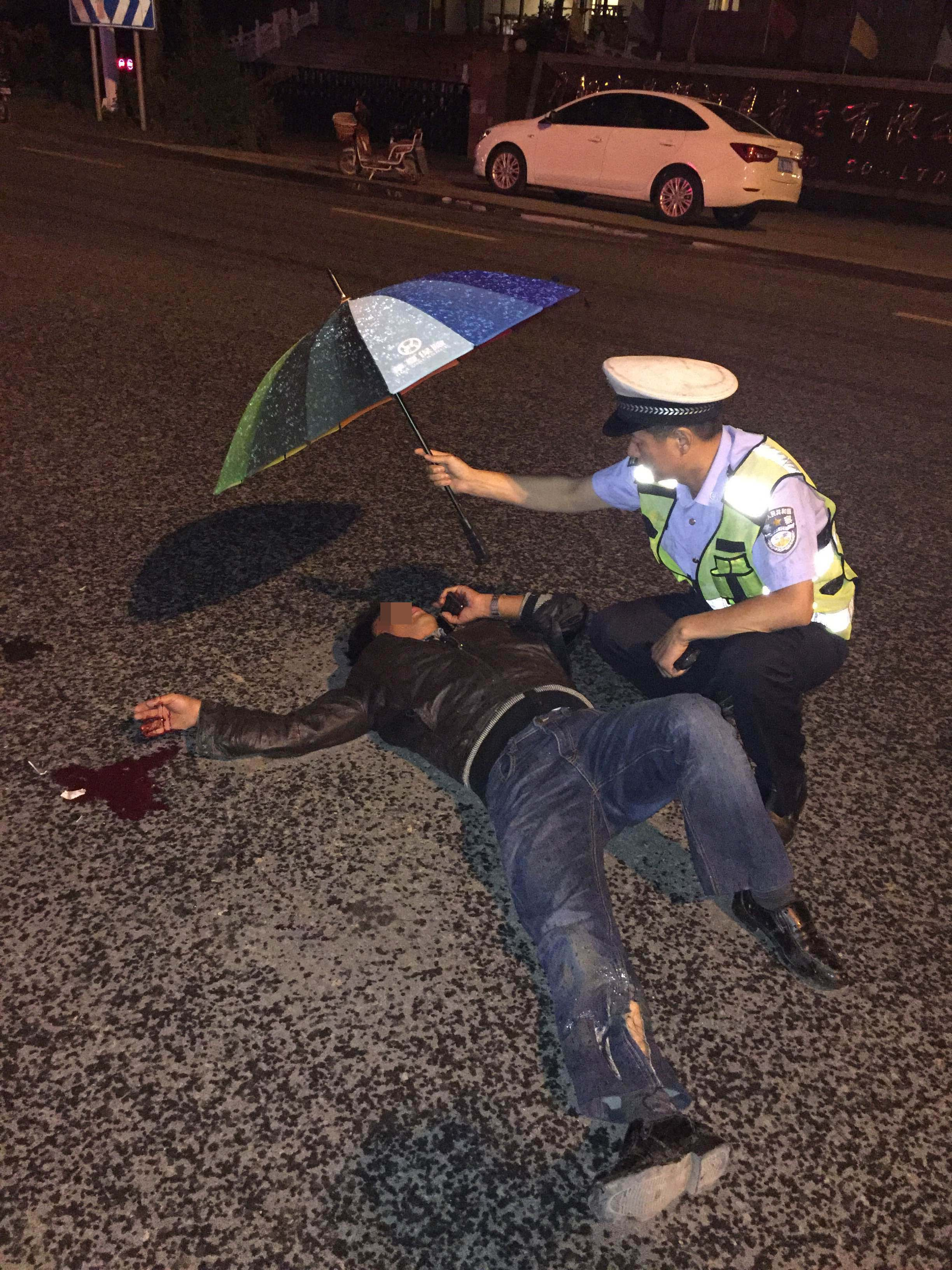 现代快报讯(通讯员 许建彪 记者 林清智 文/摄)9月28日晚上6点40分许,丹阳交警大队界牌中队民警宦建峰接110指挥中心指令得知,界牌恒隆时代广场处,一辆货车与电瓶车发生相撞,有人受伤。宦建峰接警后迅速出警,到达现场时刚好下起大雨,他不顾自己被雨淋湿,在现场帮伤者(男)撑伞,并且安慰伤者。