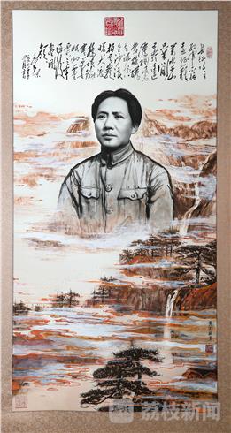 国画《长征精神 高山仰止》,以红军长征时期的毛泽东形象、《七律.长征诗》为主体,通过云蒸霞蔚、層峦叠嶂的气韵渲染,“雄关漫道真如铁”印章的映衬,体现革命历史壮举、塑造一代伟人风范。