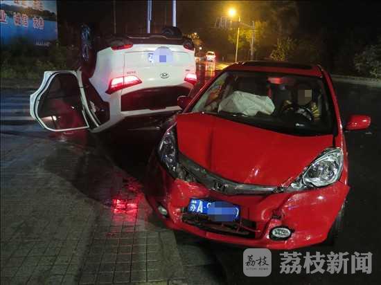 9月29日天空飘着大雨,约20时许,家住浦口的两位女驾驶员何某与刘某分别驾驶着红色本田飞度轿车和白色现代越野车在浦口区汤泉街道高速行驶,当两车行驶到汤泉街道九龙十字路口(该路口信号灯因地处偏僻车流量较少被关闭),恰巧何某驾车由南向北与刘某驾车由西向东两车在路口中心相遇,两个女司机均未按照法律相关规定减速通过,导致在路口中央发生猛烈相撞。红色飞度车损严重,白色现代越野车竟被撞翻后四轮朝天。接到报警后,浦口交警大队汤泉中队民警立即赶赴现场调查处理,经现场初步勘查发现两车在路口相遇时均未采取制动和减速措施,据了解两位女司机都急着赶路回家,万幸的是驾驶人和乘客都未受伤。目前,该事故还在进一步调查处理之中。