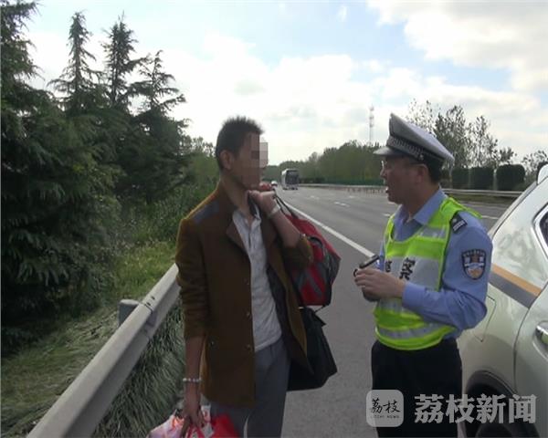 10月3日上午10点左右盐城市公安局交警支队高速一大队民警在G15沈海高速巡逻到大丰服务区向北一公里处发现有一男子大包小包的在应急车道上行走,这几天是国庆节假日,高速上车流大还是比较大,非常危险,那么这名男子为什么要走在危险的高速上呢?